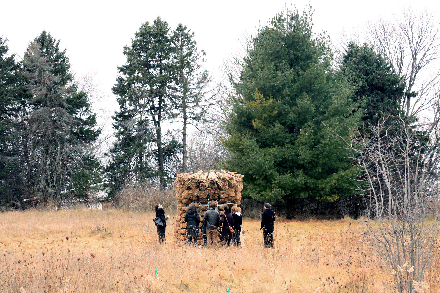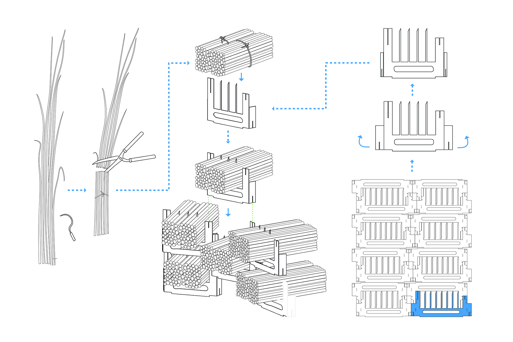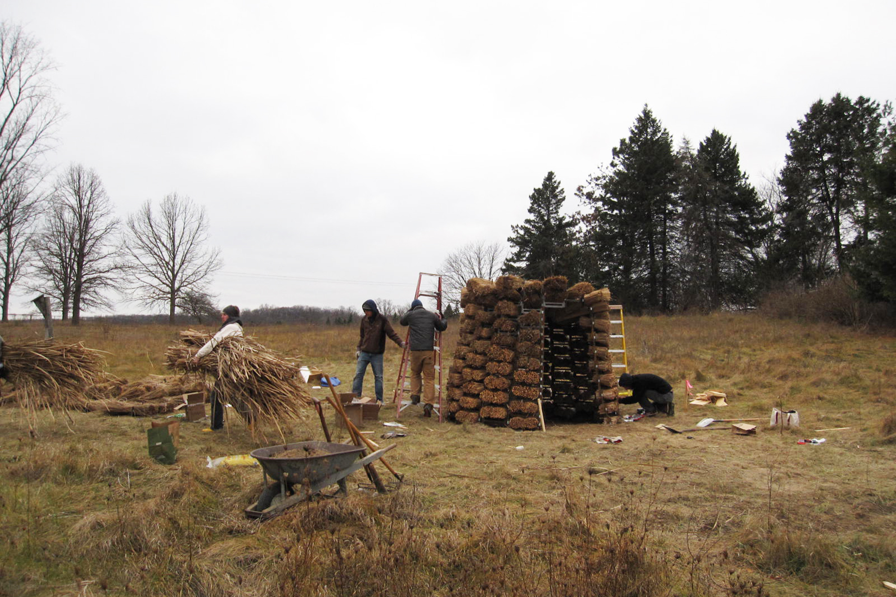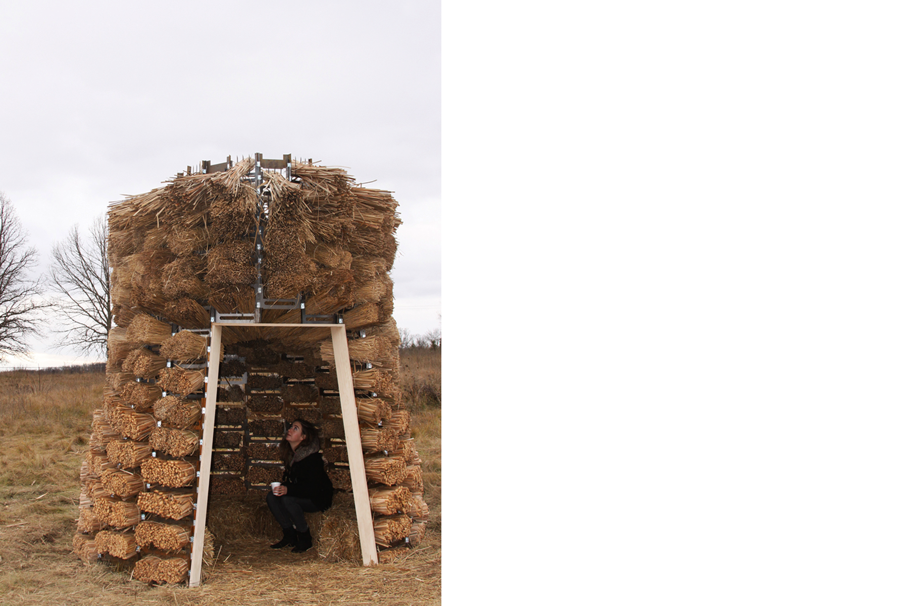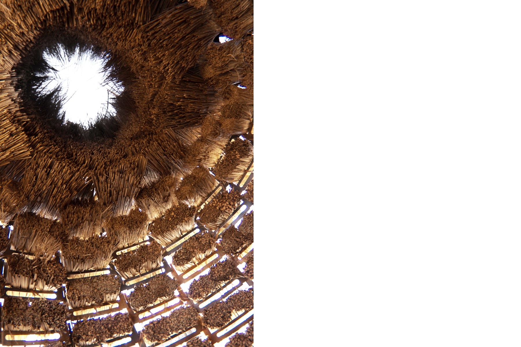 The pavilion proposed a unique way of building with thatch, using traditional techniques combined with an innovative steel structural system. Steel combs, traditionally used to thresh dried thatch, were designed to interlock and secure the bundles of thatch. The combs were bent and stacked to form a truncated cone. Cattails were harvested and dried on site, then cut and tied to form bundles. Each bundle was cut, sorted, and secured to the combs, then assembled within two days to form the final structure. The result was a perforated space with a shaggy interior and feathered oculus.